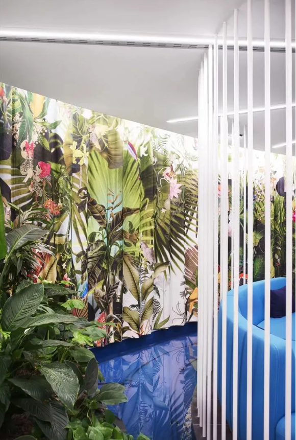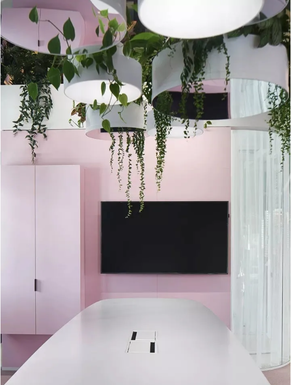 工作區采用中性色設計,利于專注工作。淡粉色的走道是真正的情緒助推器,它喚起了員工之間的情感共鳴。精心布置的水源和雅致的燈光設計有助于帶來更愉悅的心情。熱帶壁紙與柔軟的沙發和小圓桌塑造了一個熱情洋溢的活力氛圍。
