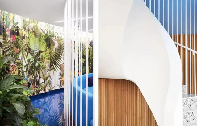 在這個項目中,一個令人著迷的挑戰是在不干擾現有結構的情況下徹底改造建筑物。設計團隊通過改變天花景觀來塑造一個完全不同的場景氛圍。在原有天花板的下面增加彩色條板裝飾。漸變的彩色條板取代了原來的灰色金屬天花板,不僅創建了空間的進深感、也讓身心感覺舒適。藍色,是一種讓人寧靜的色彩,同時能夠促進創造力。藍色向白色的漸變,增添了空間的開放感和輕盈感。