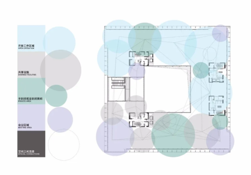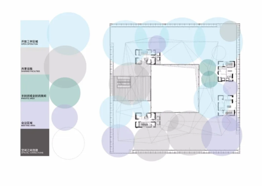 該項目的另一個重要的設計出發點是設計師期望將上海這個城市的活力與多樣性引入并轉化為工作空間的功能分布,因此,整個辦公室中從任意工位出發走到就近洽談