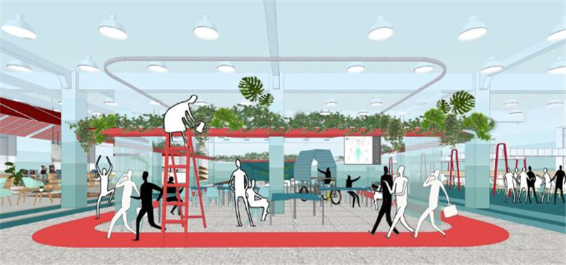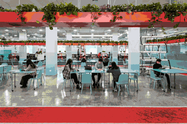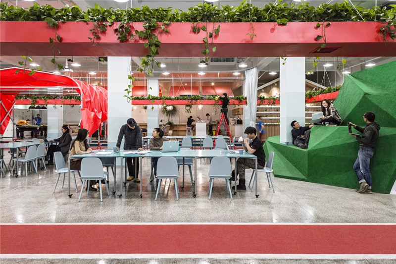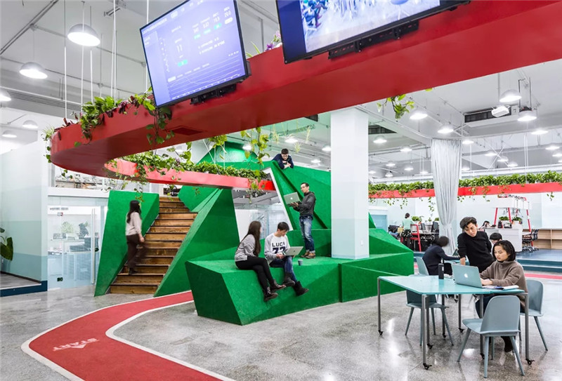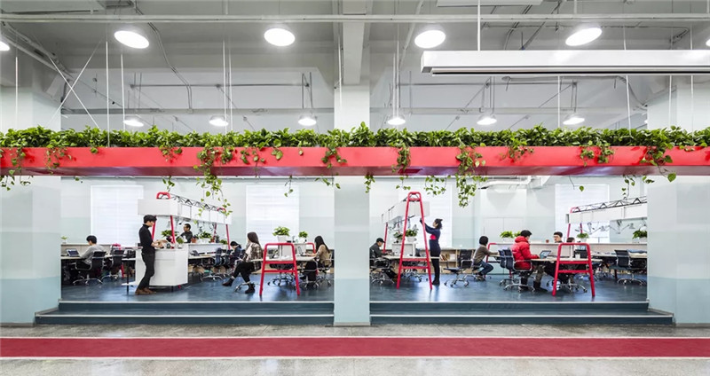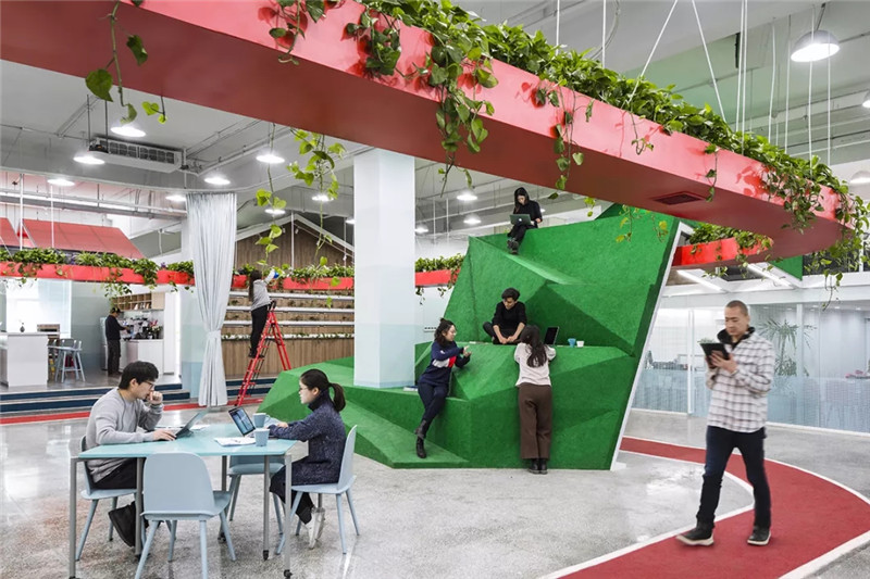5個公司由一個中間懸掛的“紅環”聯系在一起,紅環上種植蔬菜與植物,下面對應的是跑道。員工在跑道健步的同時可以打電話,也可以與照料植物的同事進行交談。