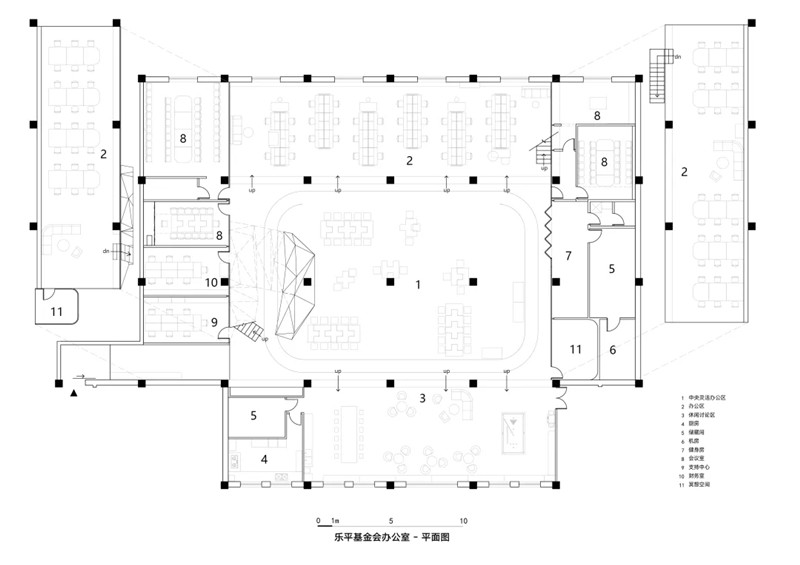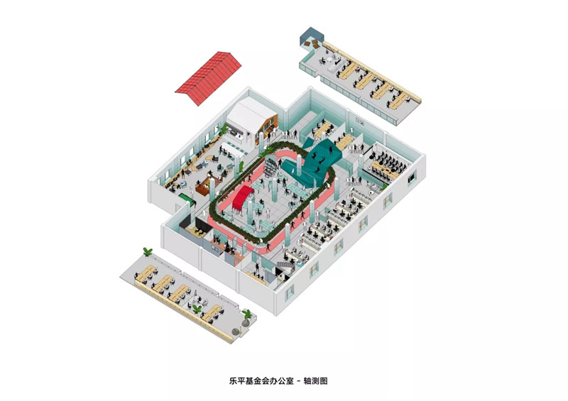 樂平基金會是一家以社會創新著稱的非營利機構。在他們1100㎡的辦公空間中,我們提出的基礎理解是適度的身體活動對大腦有益:劇烈運動通常會影響工作,但適量的活動則反而有益。在工作的同時進行一定程度的輕微運動,健康的效果堪比短暫的劇烈運動。因此設計提供了大量邊工作邊活動的機會,豐富辦公模式,也增加休息的途徑。