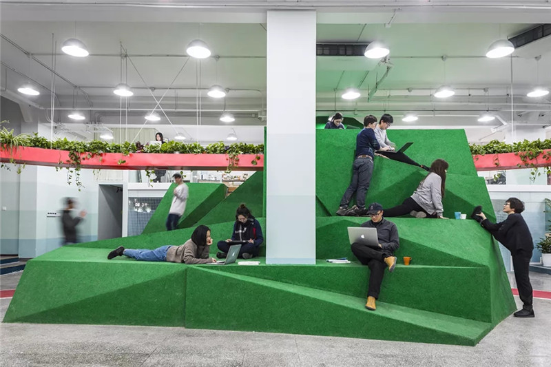 與“紅環”相交的“小山”是另一處混合休閑與工作的場所,坐落在辦公空間的另一端,傾斜的表面適應各種姿勢,中間的小路通往夾層。辦公室內還配有專門的活動空間,包括一個單獨的健身房,冥想空間和會議室。