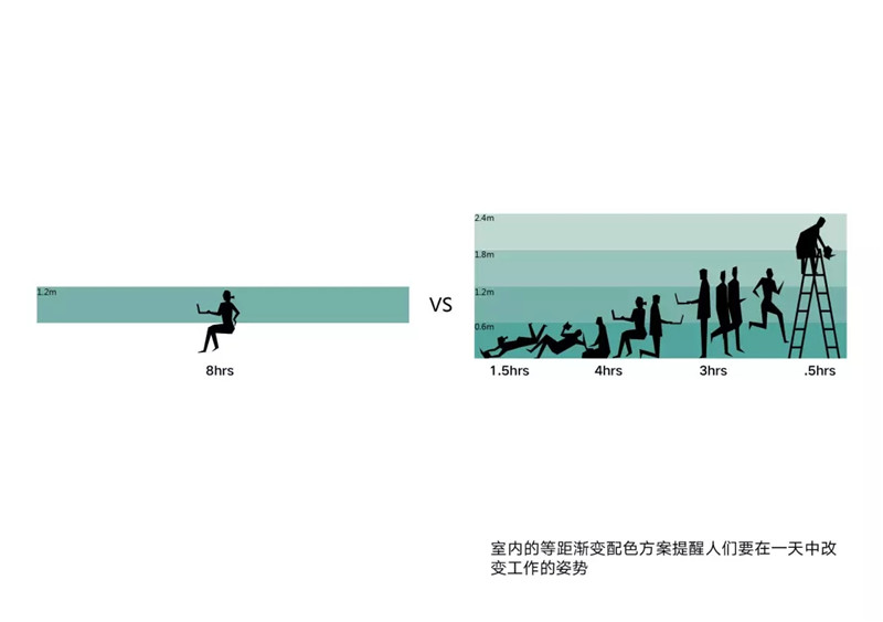 室內的顏色旨在提醒人們時刻保持活動,變換工作的姿勢。覆蓋墻身和立柱的藍色以60厘米為間隔漸變,每個顏色對應不同的姿勢和活動,如躺、坐、行走和攀爬。