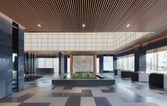 步入大廳,通過“借景”手法,將頗具詩情畫意的東方園林之景鋪呈在眼前,一抹翠綠更是讓整個空間靈動起來,巧妙而又極具視覺沖擊。在陽光照射下,投影又成為景觀的一部分,展示出自然與建筑的互動,活躍且適宜。一大排落地窗串聯(lián)起室內(nèi)外關(guān)系,正是光線的引入,讓建筑、景觀、室內(nèi)形成有序的一體。沿著預(yù)接待吧臺的動線向前穿引,便是整個銷控區(qū)域。