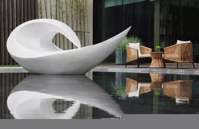 深灰色意大利火山石與柔和的沙發(fā)茶幾相得益彰,互為映襯。而光線照射進(jìn)來更是活躍了整個空間,落地窗外便是庭院。水景區(qū)域一只白天鵝正在梳理羽毛,而水畔一側(cè)的休息區(qū)域更是增添了一縷閑情逸致,營造一種靜謐愜意的氛圍。