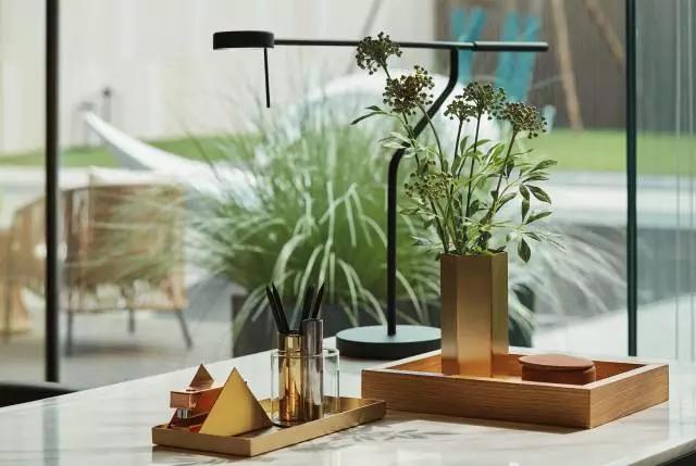 利用建筑層高優(yōu)勢,在沙盤區(qū)上方創(chuàng)造層次豐富、光影虛實(shí)變化的幾何造型,強(qiáng)化空間錯落感。通過動軸引伸便是洽談區(qū)。設(shè)計(jì)方案不希望洽談區(qū)和接待區(qū)域過于直接,通過造景形式將兩個空間自然串聯(lián)并分割開來。花藝在靜水面的映射下,光與影默契配合,有效避免了接待臺前的空曠,也營造出了整體空間的美學(xué)秩序。