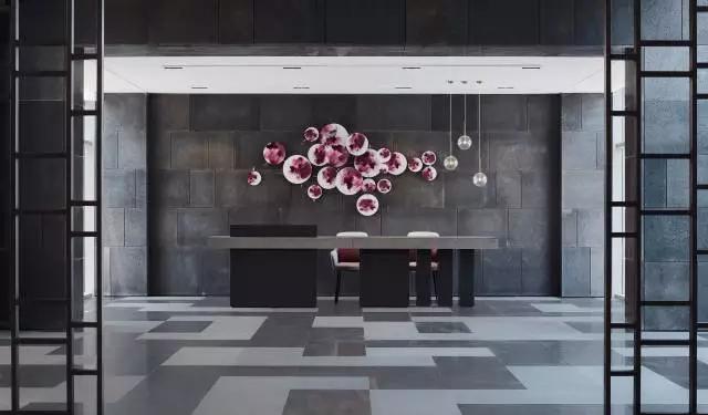 預(yù)接待吧臺與大廳講究整體的對稱平衡,通過巧妙的吧臺構(gòu)成形式、空間吊燈的位置,呈現(xiàn)靈動的立面關(guān)系,有效緩解空間的呆板。大面積深灰色石材,配以紫色壁飾花瓣式鋪灑開來,夾雜一絲神秘感,東方韻味無限彌散。
