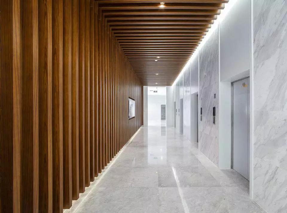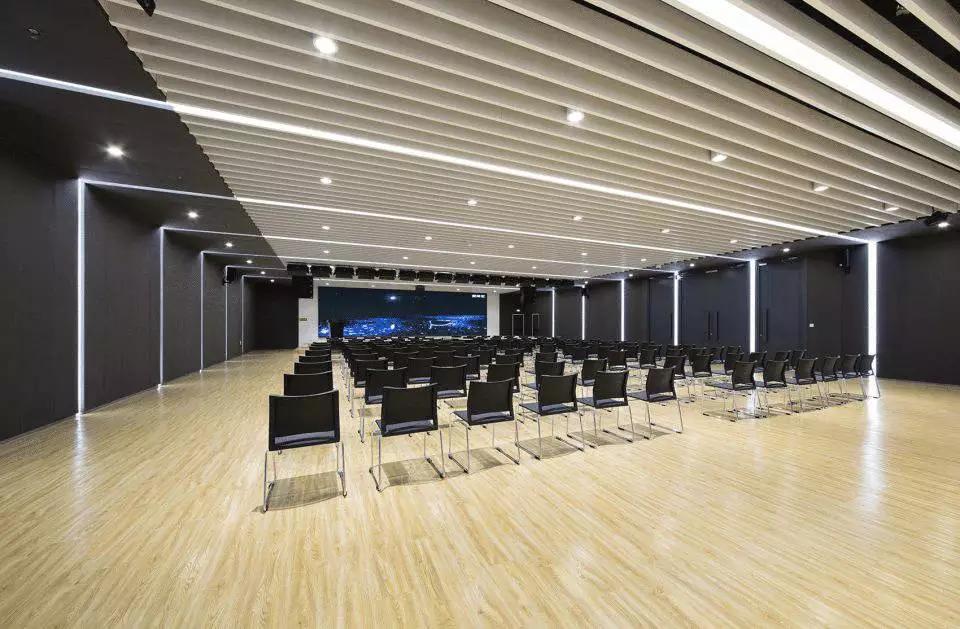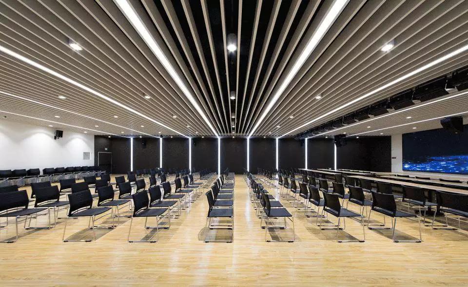不同的空間內容對應不同的材質氛圍,從色彩到質感,再到意象化的裝飾,我們依據大堂、會議、休息室、中庭等不同空間尺度與空間內容營造新穎豐富、恰如其分的空間氛圍。溫暖的木色、混凝土板、白色大理石和白色乳膠漆為主要材料,其中報告廳大異其趣,優雅高貴的深灰色布藝軟包與報告廳的相對集中和封閉性相得益彰。我們依托原有建筑空間序列,如大堂-電梯廳-等候區-多功能廳-VIP室-展廳,調整改變室內設計的溫度與濃度,為原本純功能理性化的空間組織蒙上一層魅力面紗,讓功能化的“經過”變為一次不舍的駐留與感受。