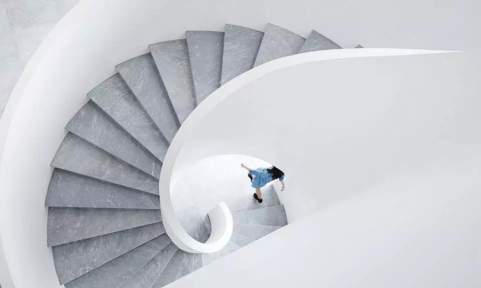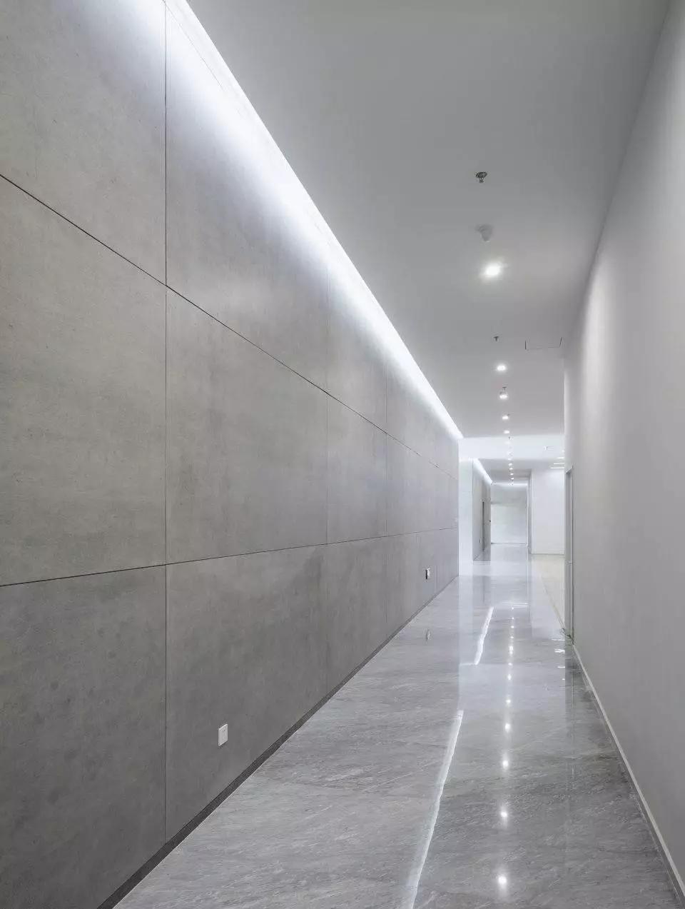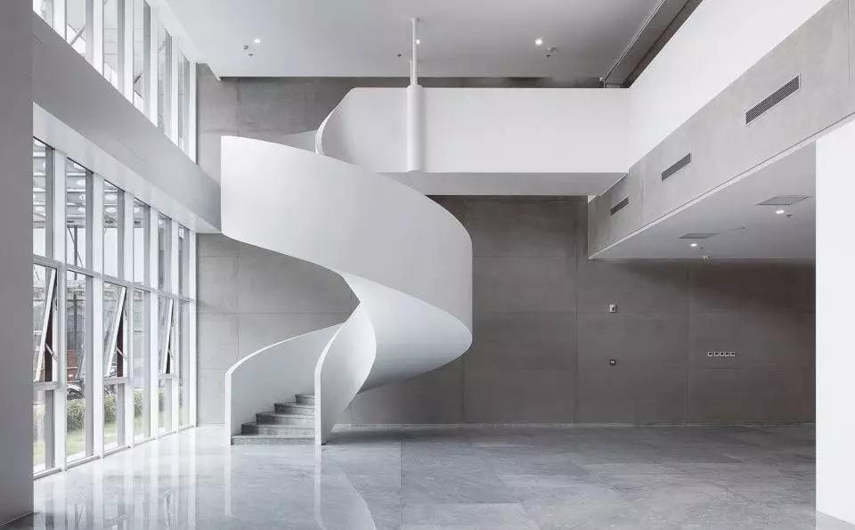 從中庭的自然光到室內的人工光,大廈的光影在豁然開朗和細致入微之中不斷變換。中庭必須和天空有所交流,尤其是霧霾肆虐的今天,藍天顯得特別稀有,在中庭上方加蓋玻璃幕墻為上策。流空素影正翩翻,使得存在于強烈靜態空間體驗中的人又能同時感受到光影與云卷云舒的動態變化。在典型的辦公樓層,小型私人會議室從中庭立面懸挑而出,并錯落有致,打破了中庭的單調,并增加了最小辦公空間的面積。一側的螺旋樓梯飄逸靈動,用混凝土演繹出的獨特輕薄感如風裳皎立,引辦公的人們靈感興發。