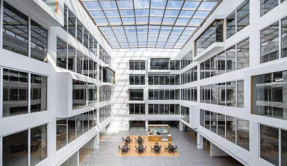 為了改善主要公共區域的動線,設計加大了報告廳和中庭的入口面積。另外還在大堂增設了一個旋轉樓梯,導引訪客從首層直達二層中庭。為了在公共走廊和中庭之間增加透明度,大部分會議室設置在二樓的中庭兩側,同時也增加公共中庭的活動。中庭還設有一個小咖啡廳,租戶和游客可休息和相互見面。