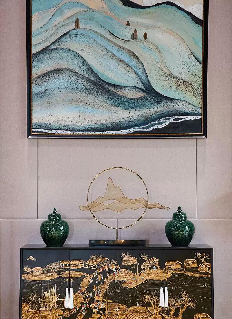 “湖光山色”項目位于西安歷史遺址觀光帶上,毗鄰鎬京遺址公園與斗門水庫,四周環境怡然靜雅,歷史文化氣息濃厚,近期其營銷中心已完工,軟裝設計交由深圳印象空間呈現。結合周圍環境及甲方需求,印象空間最終將西安古都情懷融于作品中,于細微之處傳遞意境之美。