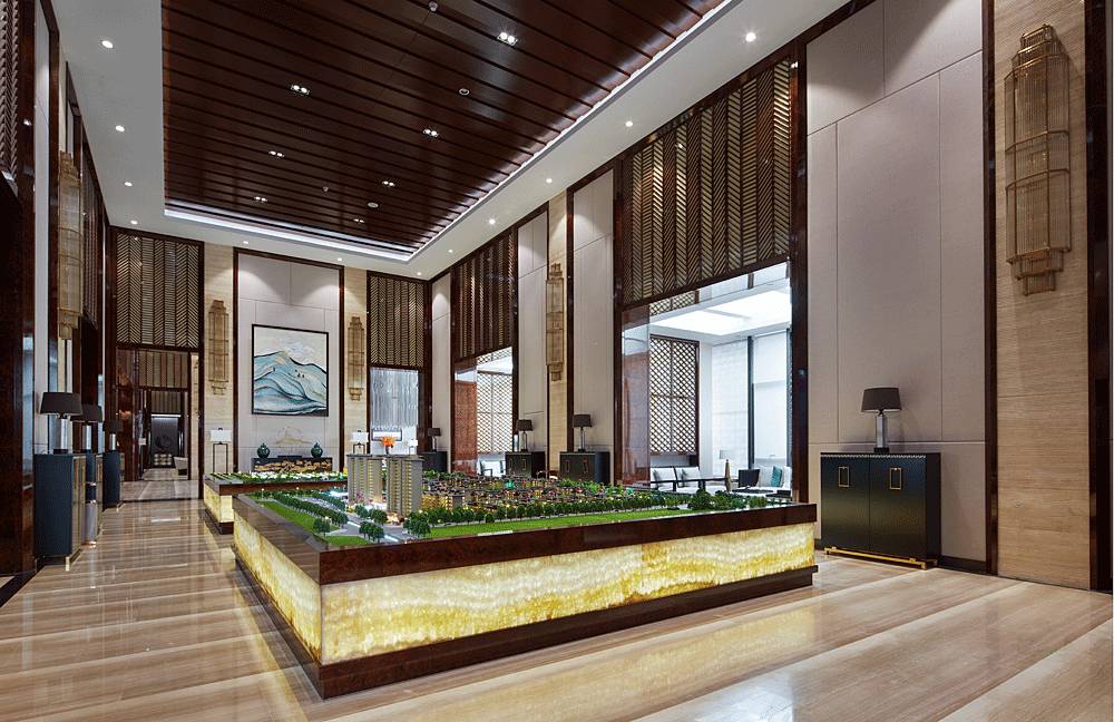 沙盤區采用簡單、大氣的設計手法,沒有濃墨重彩的奢華場景,更多的是將歷史古都的韻味帶到細節中,如格柵、窗欞、黛青色擺件、意境掛畫等東方元素都透露著古韻,并融入大理石、玻璃、燈帶等現代材料,在營造意境的同時兼顧場所的使用功能。