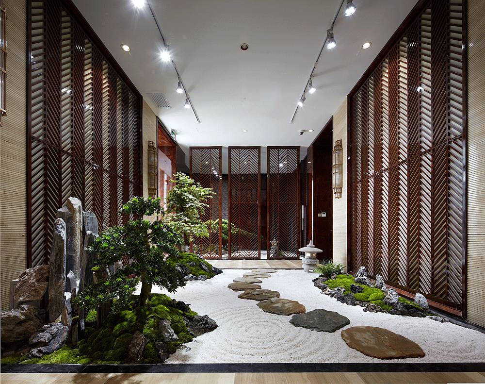 值得一提的是,走廊干景步道的景觀軟裝,一個集觀賞、生態、自然于一體的設計。小巧石籠、粒徑不等的灘石,旱濕均可培植的苔草地被,有機地組合在一起傳遞古樸自然的審美趣味,讓營銷中心的意境之美濃郁幾分。