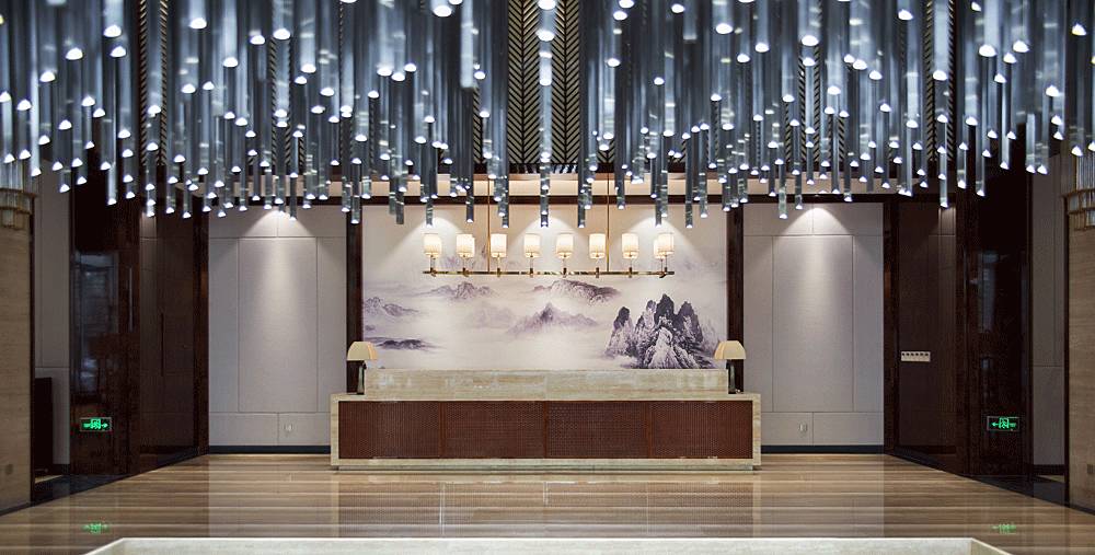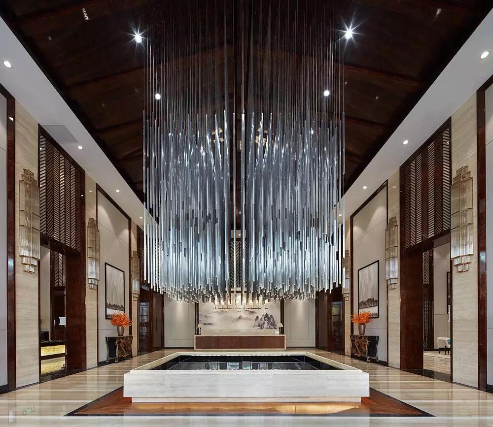 進入大堂中心,便被一個奪人眼目的裝置藝術吸引,數百根不銹鋼條垂吊而下,宛如瀑布“飛流直下三千尺,疑是銀河落九天”,成為整個空間的視覺焦點,啟動后,水珠從不銹鋼滴落到地景的水中,呈現出“大珠小珠落玉盤”的動感。