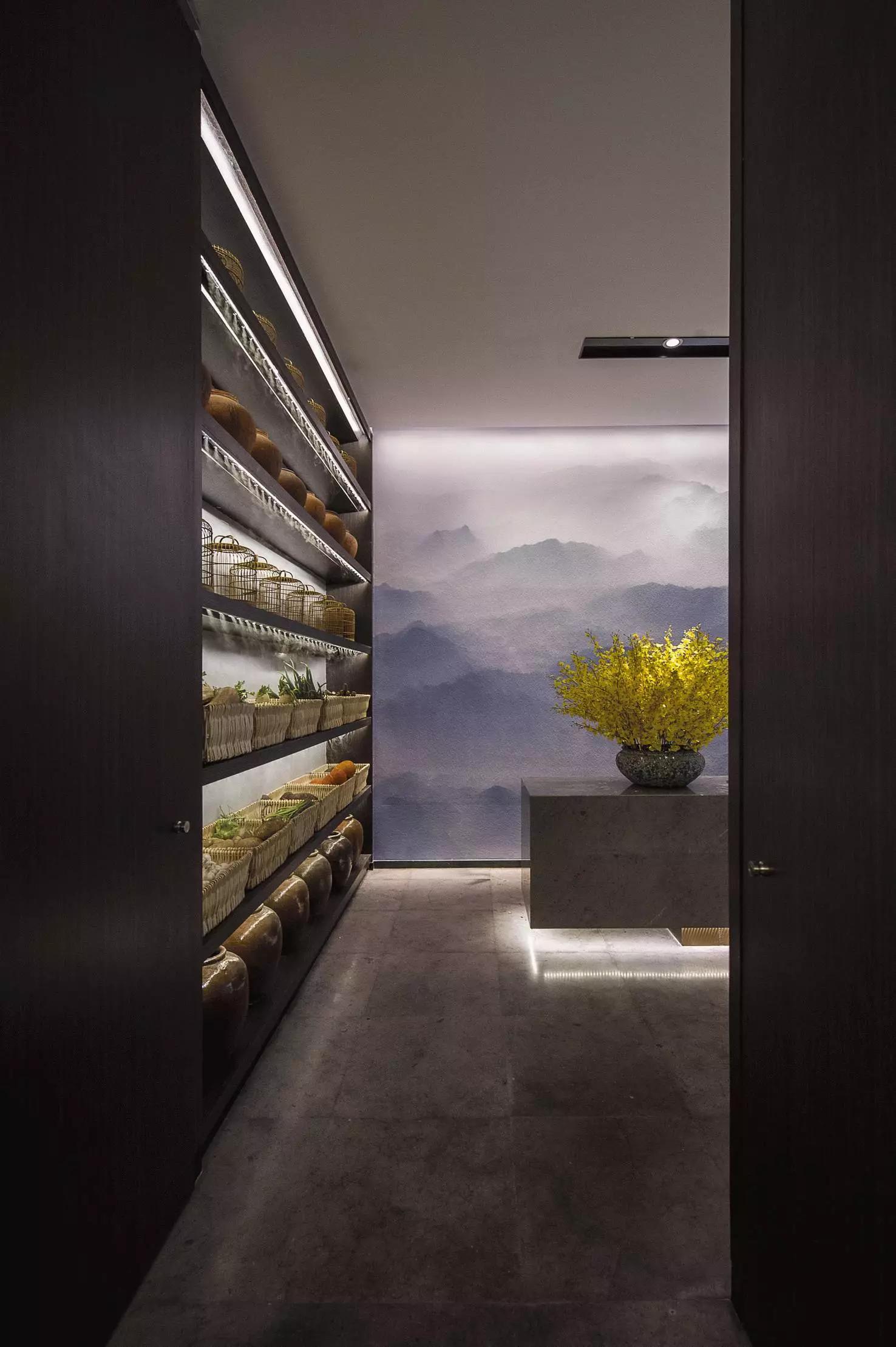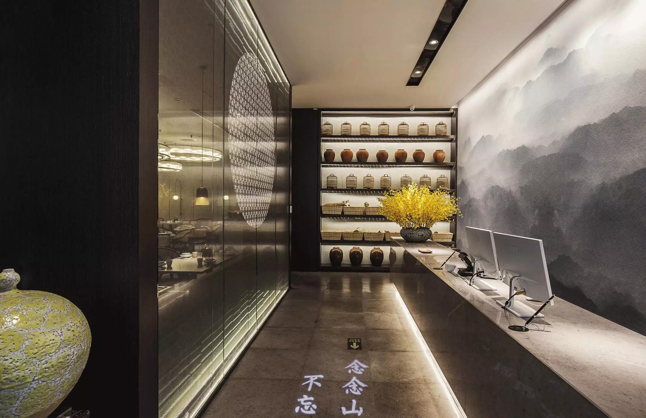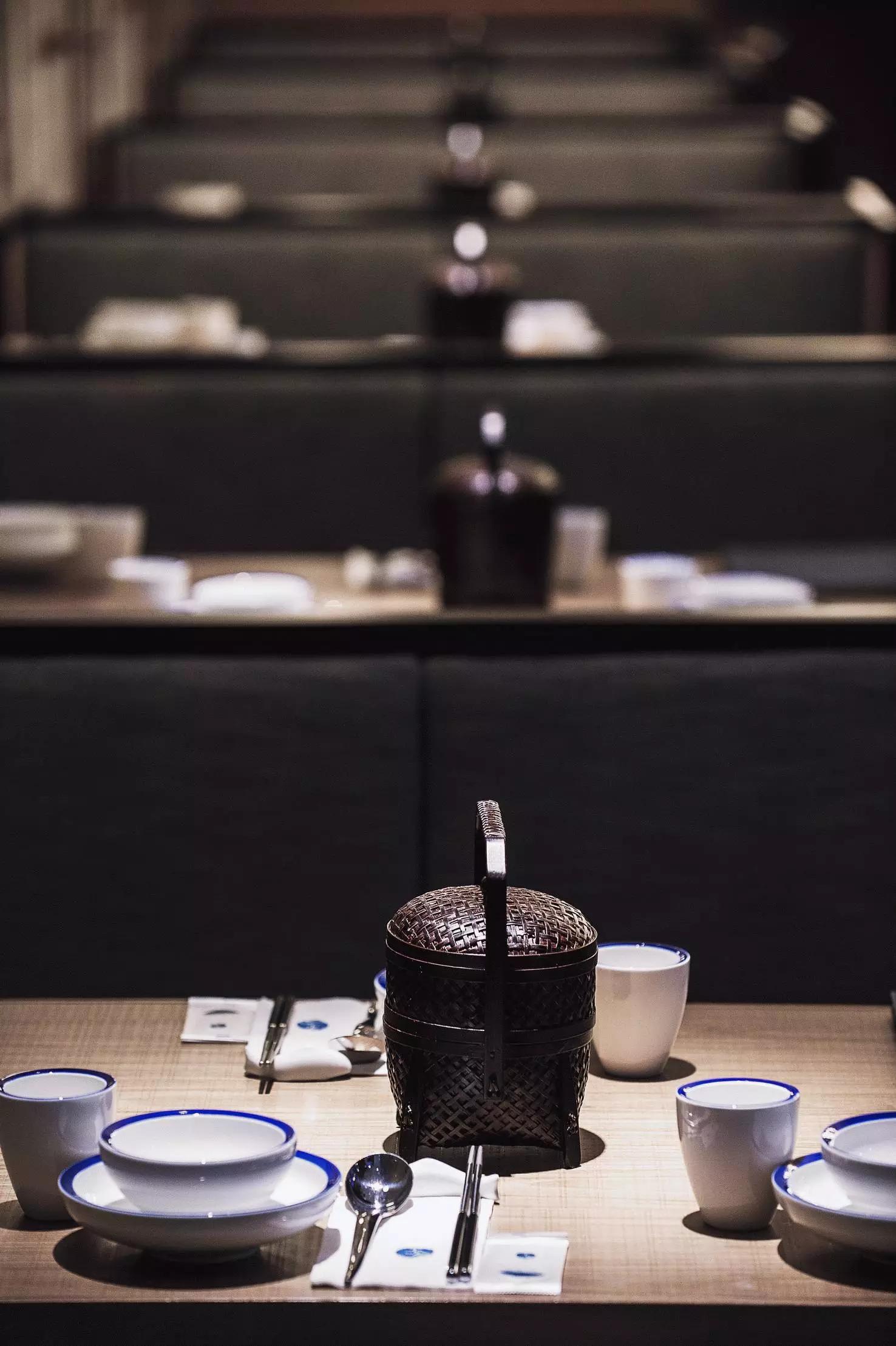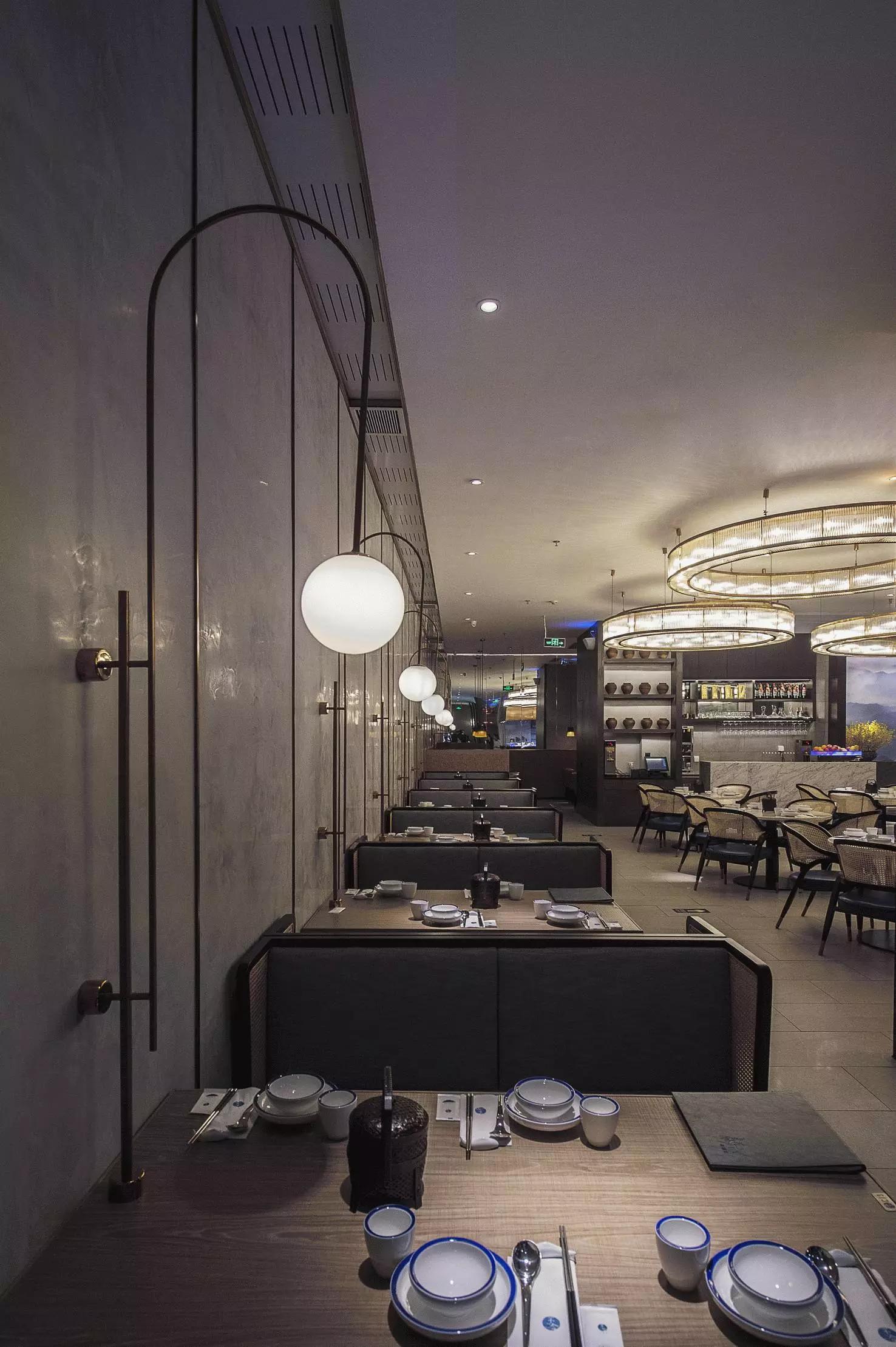 設計中廣泛使用了灰藍色調的石材,地磚,皮革,墻板,結合清新的藤編,厚重的木材,充滿質感的不銹鋼以及別致的燈具和光線,讓整個空間既清新優雅又不失質樸,讓人雖身處鬧市卻仿佛置身于海的廣渺與山的深幽,又始終籠罩在一層淡淡的氤氳不去的“鄉愁”之中。