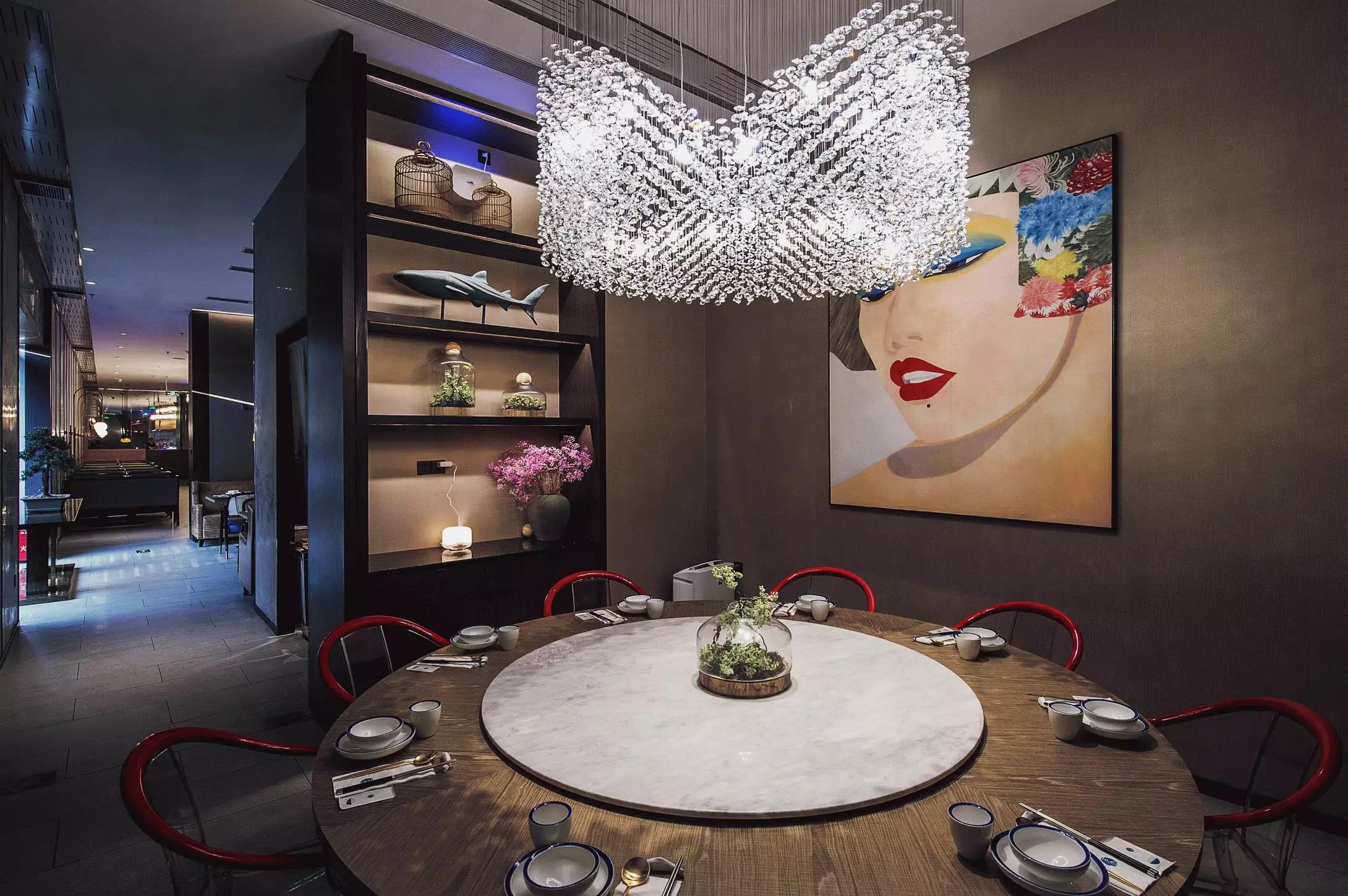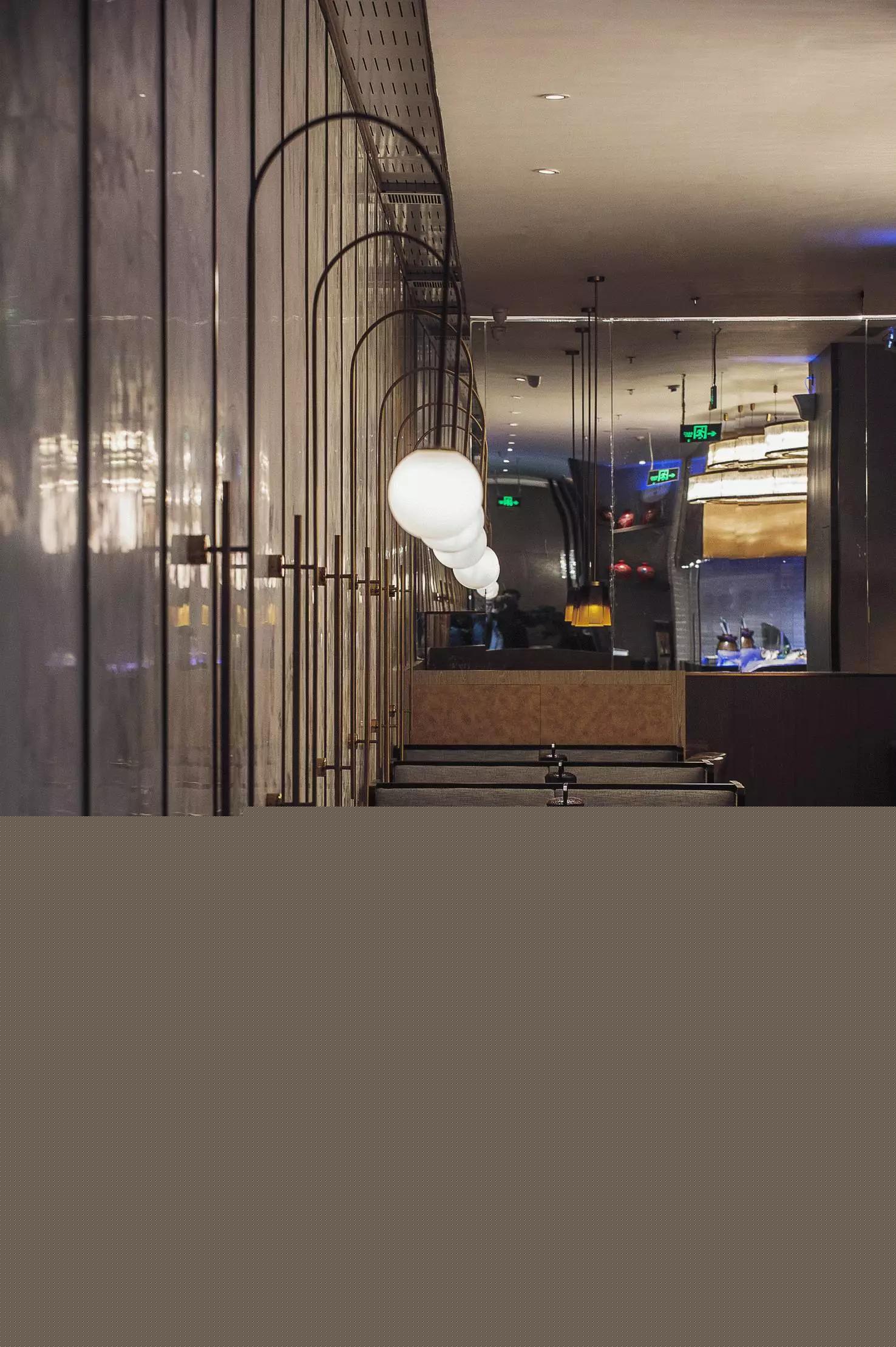 用餐區完全是一個開放的空間,沒有很多的隔斷,圓桌和方桌有序排布,既充分利用了空間又避免了單調,結合燈具的設計,就像在老家庭院里的大家庭聚餐——夜晚,歸來的親人們,在清涼的月色中,你來我往,和和樂樂,傳遞此間。