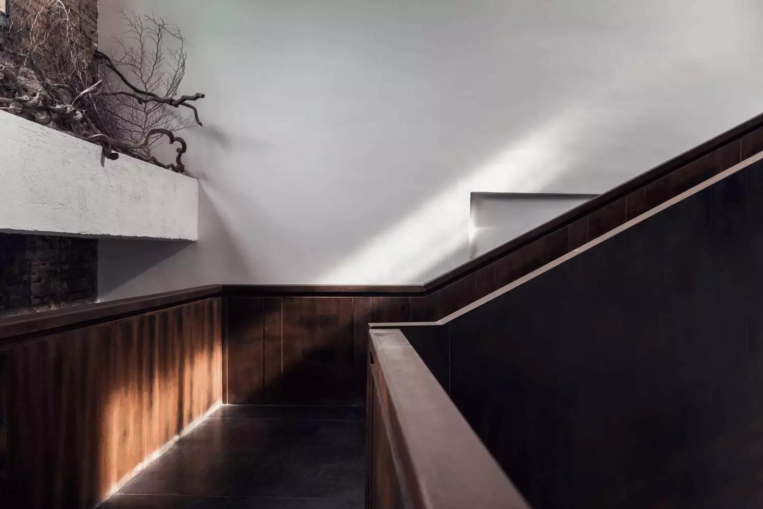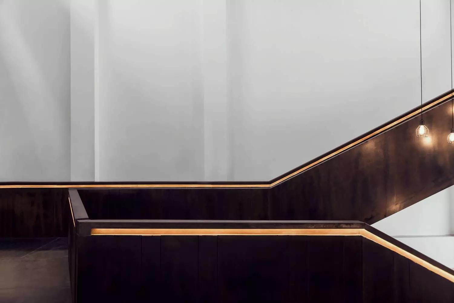 直線組合而成的吊燈利落的拉伸在樓梯中部,與不斷變化、充滿戲劇色彩的自然光互相補充,吊燈的照明使空間更平衡與緩和,穩定了光影變化中的視覺感受。