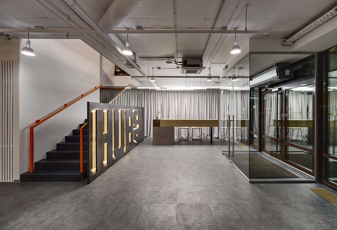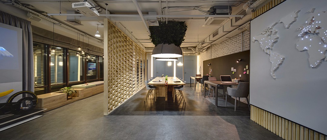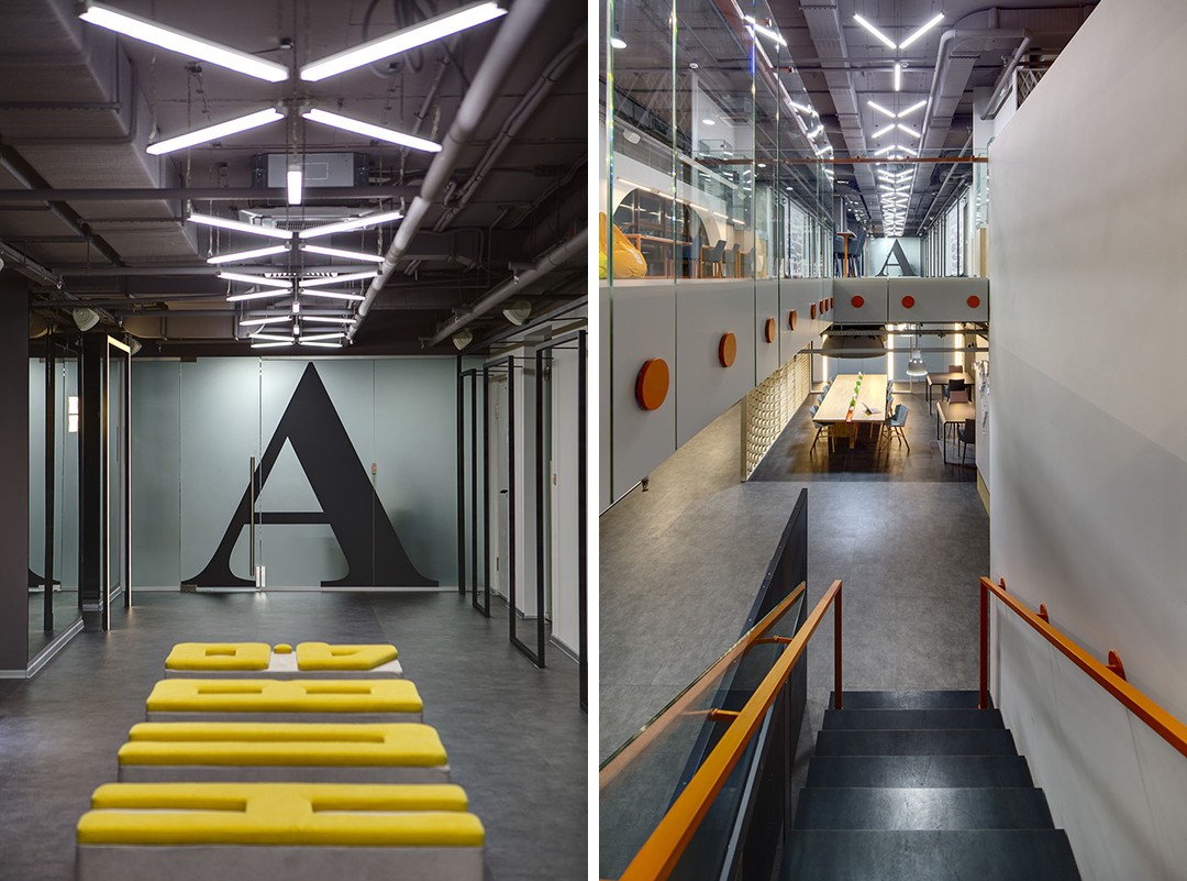 邊座椅、環形休息區等,可以作為工作、溝通、做演示、聚會或演講的場所。三樓設置有共用辦公空間、會議室、網絡電話室、以及幾個主題會議室,