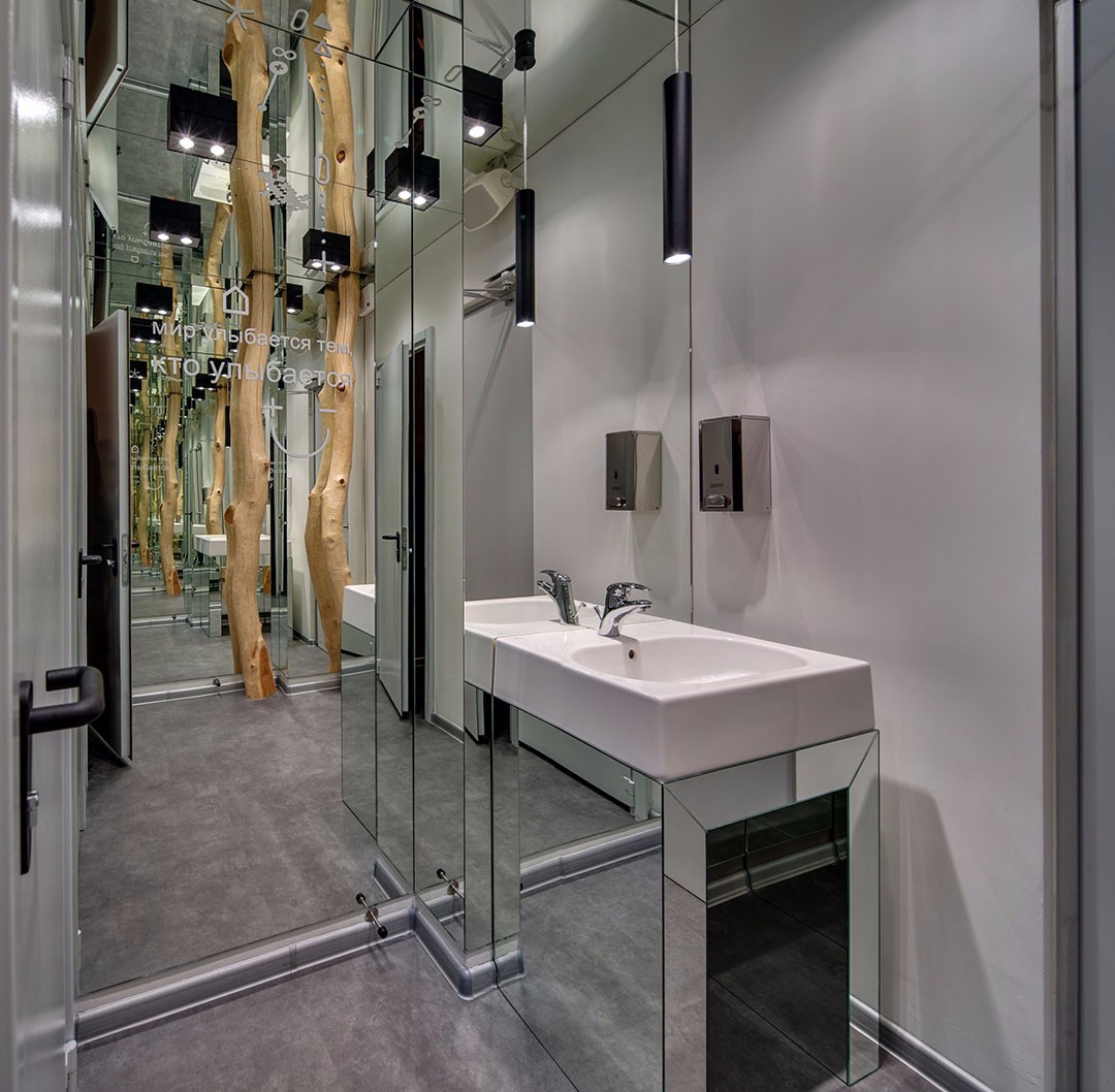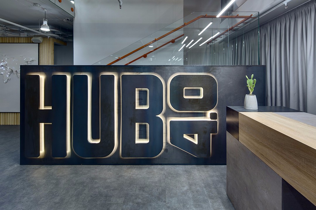 整個空間共有三層。一層空間將有照明的大型金屬logo面板緊貼玻璃樓梯圍欄設置,歡迎客人的到來,并通過動態照明來強調出長接待臺。