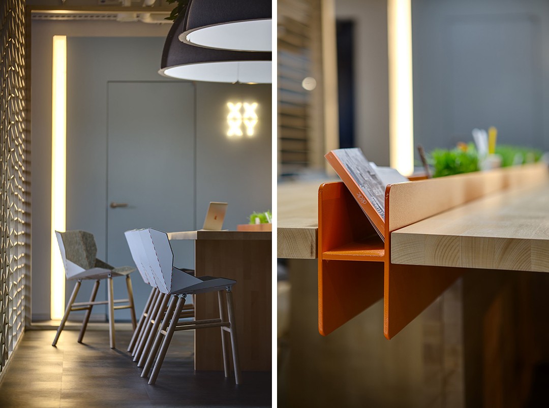 工作區域和交通區域通過膠合板材質的結構墻分隔開。二樓設置了簡單的可變空間和大量可用于非正式溝通的場所——咖啡座、有著舒服軟靠墊的床